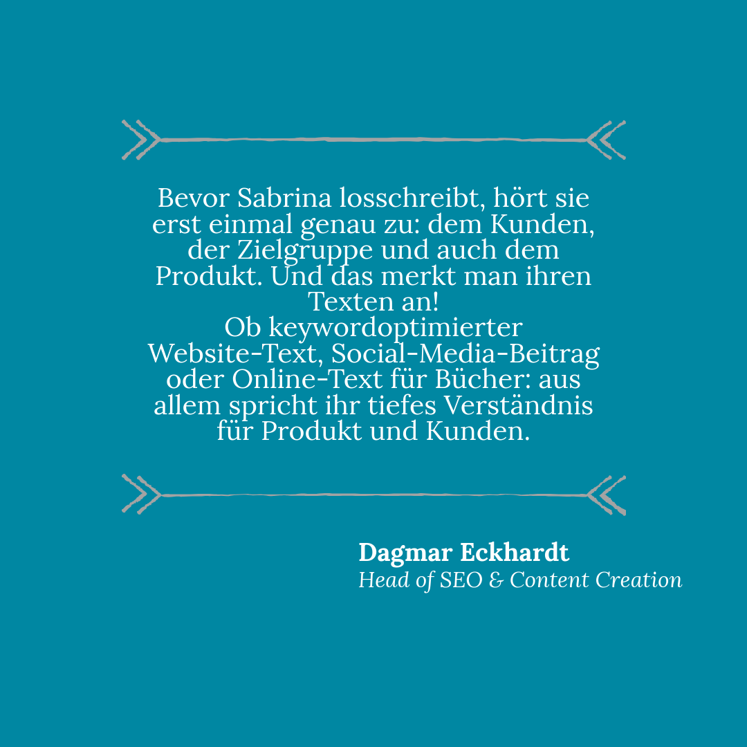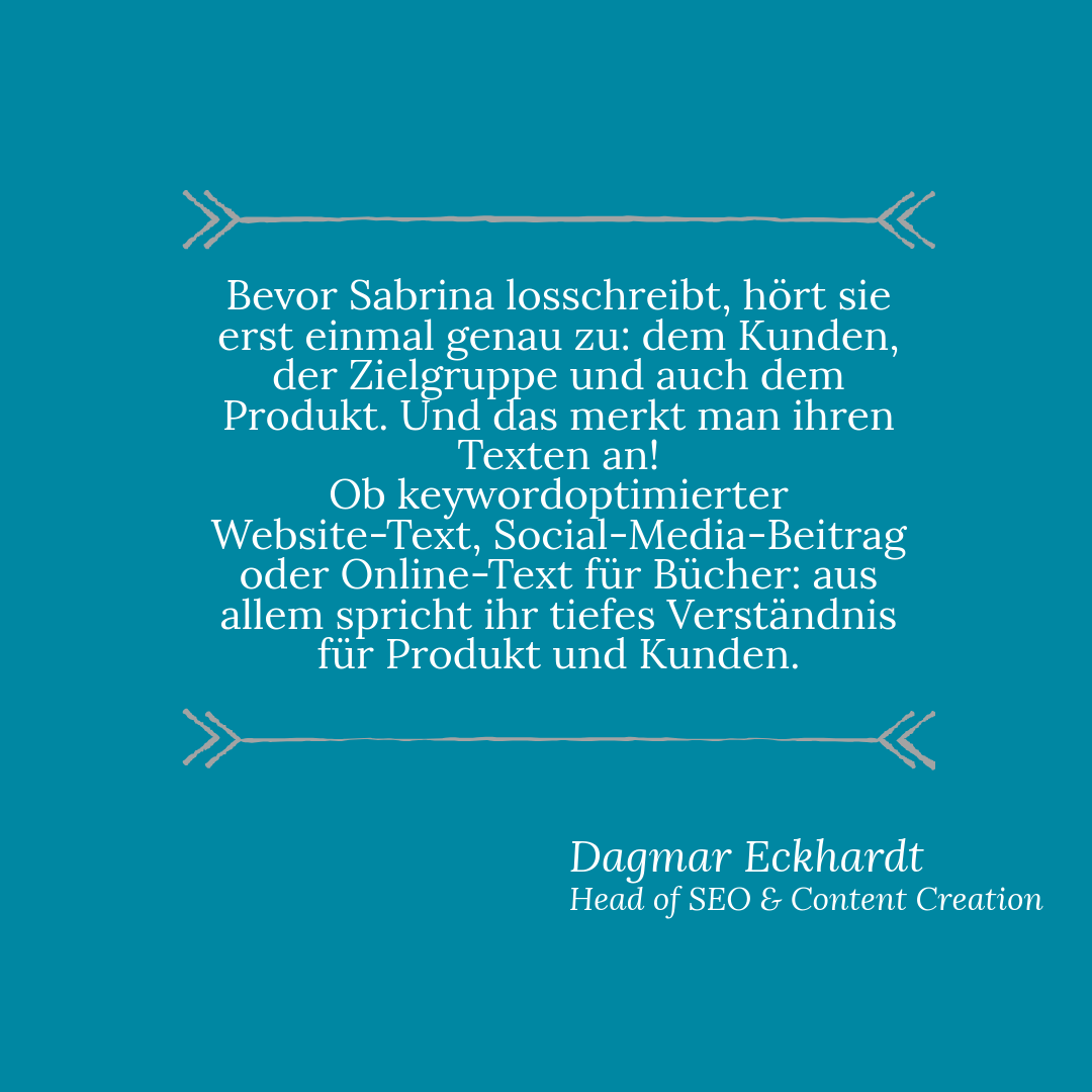 Die Basis für erfolgreiches Marketing ist und bleibt das Wort, ob in Form einer ansprechenden Produktbeschreibung, suchmaschinenrelevanter Keywords oder überzeugender Anzeigentexte. Ich mache Bücher, Produkte und ihre unwiderstehlichen Vorzüge sichtbar, erzähle die Geschichten hinter Marken und Unternehmen und spüre passende Zielgruppen auf. Am Ende steht einzigartiger, individuell erstellter Content – frei von KI-Mittelmaß. Und der wirkt! Online und im „real life“.